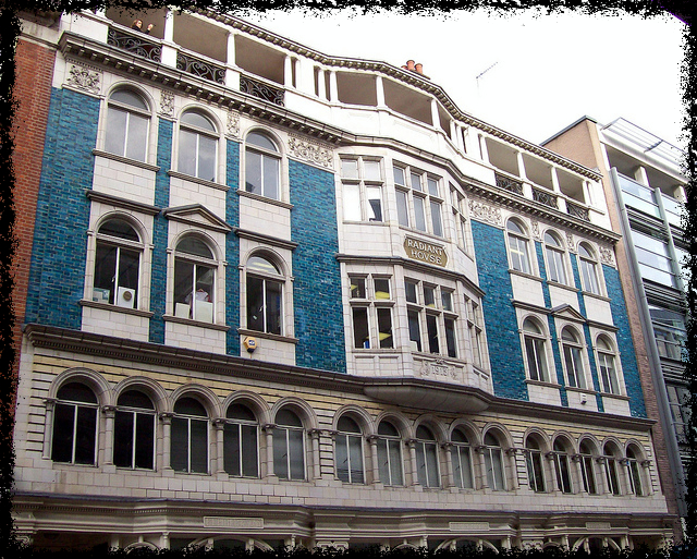 This is ‘Radiant House’ on Mortimer Street, just round the corner from my old office. I walked past it most mornings, always looking up, depending on the route I took from the station. I’m no architect nor architectural historian, but I know enough to see elements of classical styling with even touches of art deco (the wrought iron inserts on the top floor). Radiant indeed. Would we see aquamarine tiles on a building today? Yet look. Just below the name of the building is a smaller inscription. 1915. The year of the Dardanelles. Gallipoli. The Second Battle of Ypres. It’s difficult now to imagine the mood of disquiet & national depression as losses mounted up. Here is a beacon of hope, the building says.